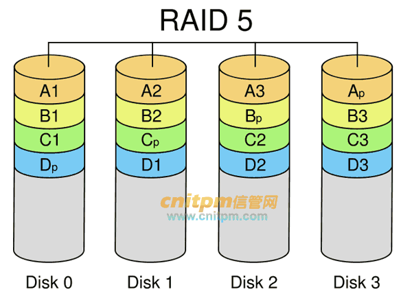 RAID 5 是一种存储性能、数据安全和存储成本兼顾的存储解决方案。 以四个硬盘组成的RAID 5为例,其数据存储方式如图4所示:图中,Ap为A1,A2和A3的奇偶校验信息,其它以此类推。由图中可以看出,RAID 5不对存储的数据进行备份,而是把数据和相对应的奇偶校验信息存储到组成RAID5的各个磁盘上,并且奇偶校验信息和相对应的数据分别存储于不同的磁盘上。当RAID5的一个磁盘数据发生损坏后,利用剩下的数据和相应的奇偶校验信息去恢复被损坏的数据。