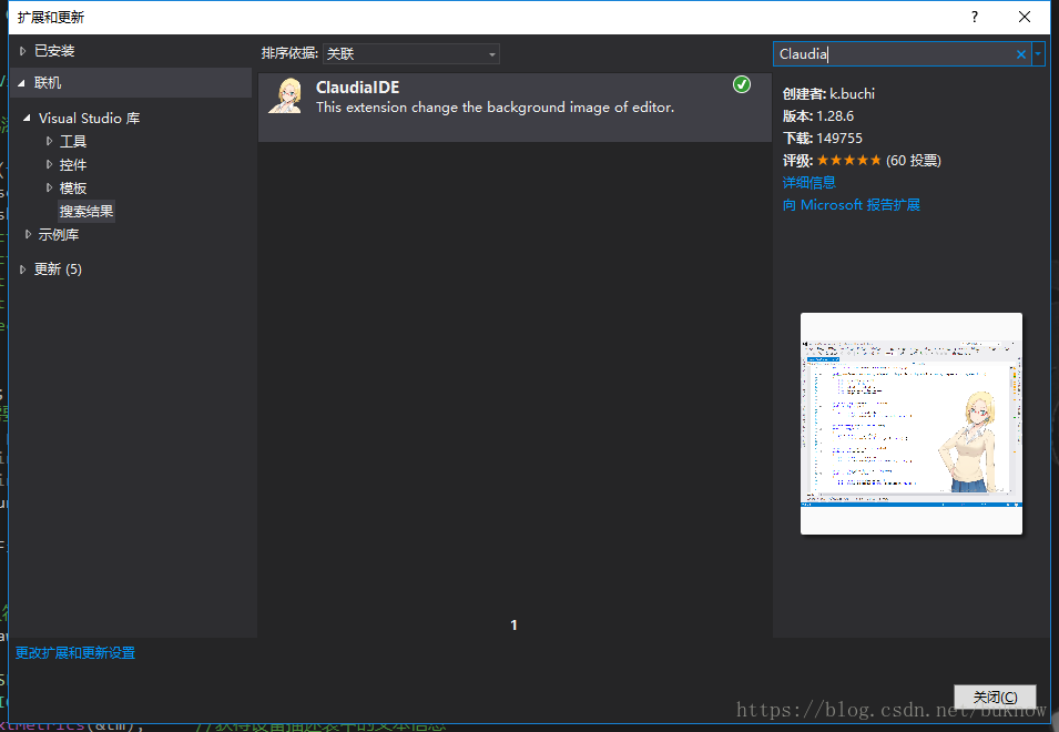 今天电脑上刚装上VS,感觉编码界面有些单调,便想着更换一个背景图片。 要设置一个背景图,VS本身不支持直接更改,但是可以通过下载他的一个插件——ClaudiaIDE便能实现。步骤如下: 1.打开Visual Studio菜单栏里的 :工具→扩展和更新。 2.点联机,在搜索框里输入“background”或直接搜索“Claudia”,搜索到后,可以在右边进行...