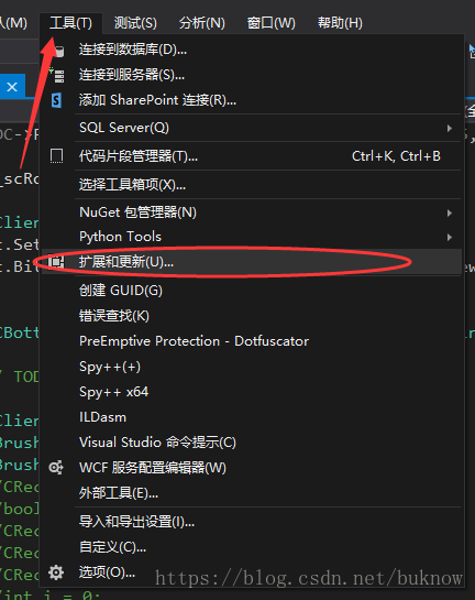 1.打开Visual Studio菜单栏里的 :工具→扩展和更新。