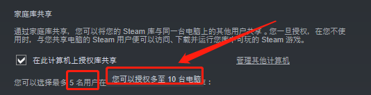 Steam家庭库共享功能,能同时授权库共享给10台计算机,但只能选择授权给5名用户使用共享的游戏库,超过数量会授权失败。