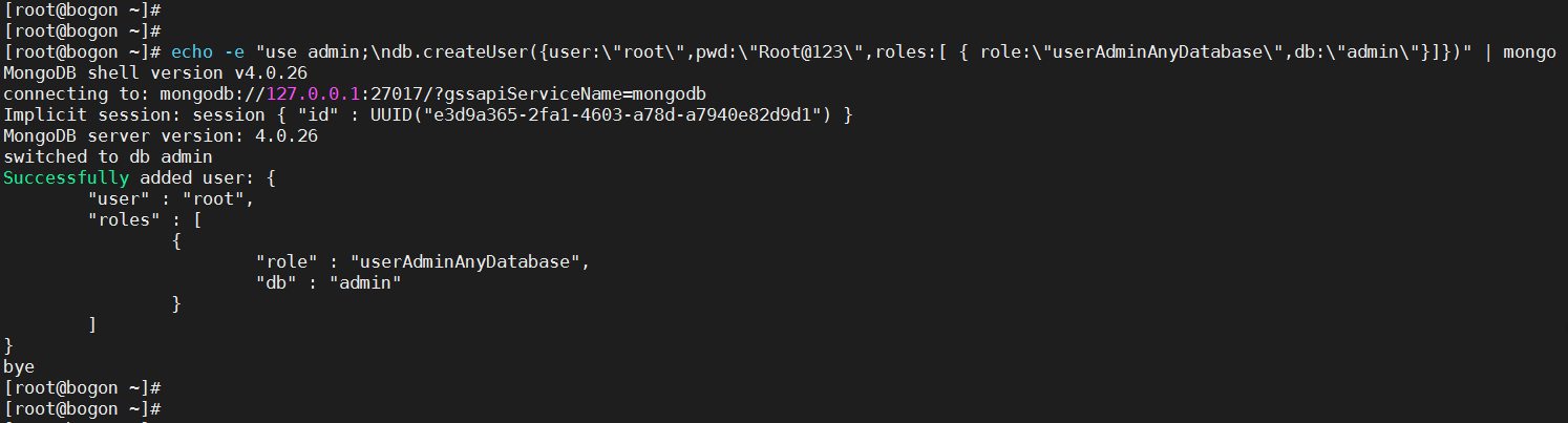# echo -e "use admin;\ndb.createUser({user:\"root\",pwd:\"Root@123\",roles:[ { role:\"userAdminAnyDatabase\",db:\"admin\"}]})" | mongo --host 127.0.0.1 --port 27017