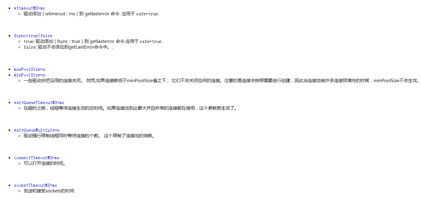 connectTimeoutMS //超时之前尝试连接的时间(以毫秒为单位)。默认值是永不超时,尽管不同的驱动程序可能有所不同,请参阅驱动程序 文档。