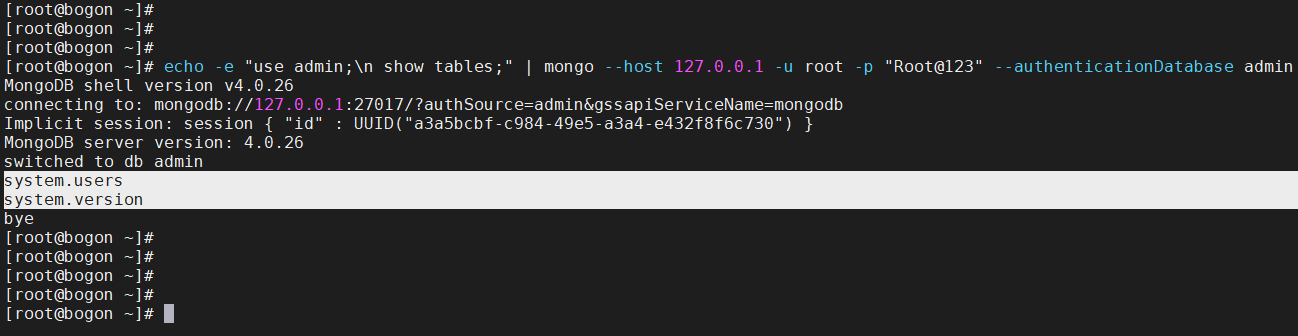 # echo -e "use admin;\n show tables;" | mongo --host 127.0.0.1 -u root -p "Root@123" --authenticationDatabase admin