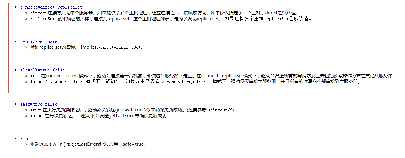 应用(如java应用)中jdbc连接mongoDB的字符串中一定要指定库名,如果是replicaSet只需要填写所有主从的地址,而不是填写replicaSet名称