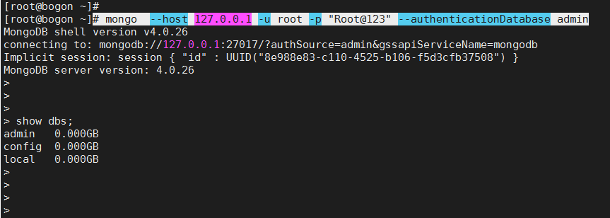 # mongo --host 127.0.0.1 -u root -p "Root@123" --authenticationDatabase admin