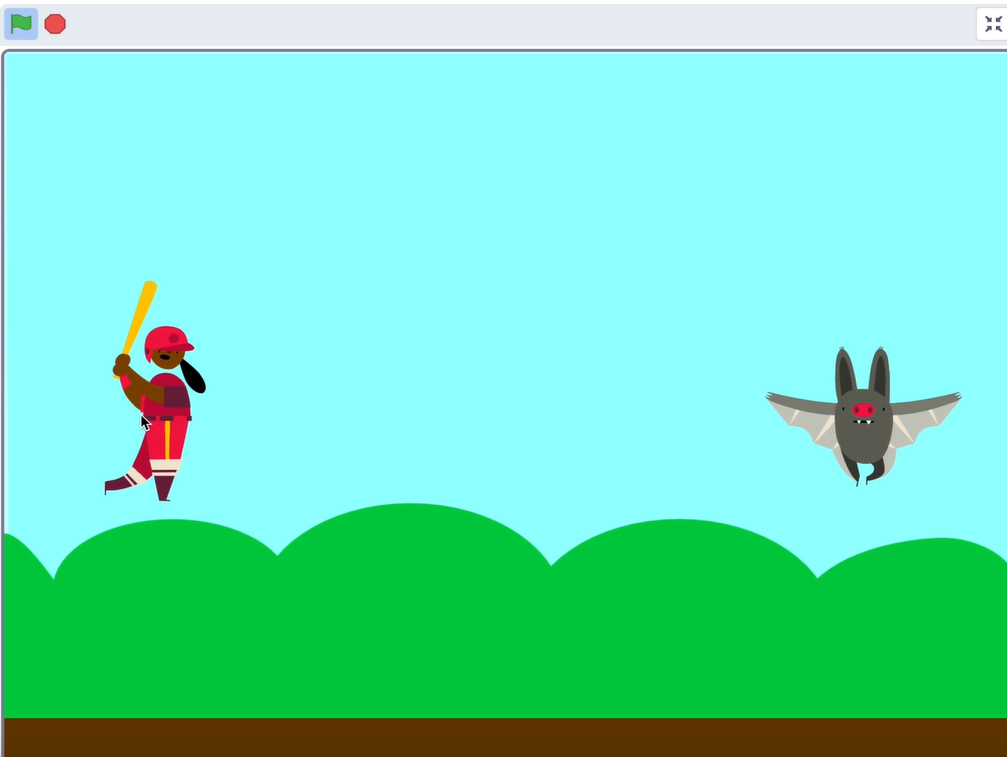 在这个游戏中,当你点击绿旗开始游戏,会进入blue sky背景,并且播放背景音乐。此时,舞台的左边有一个棒球手,右边有一只蝙蝠。你可以通过鼠标上下移动棒球手,当用鼠标点击棒球手时,他会挥动球杆,击打出一个棒球向右边飞去,当棒球碰到舞台边缘就会消失。蝙蝠会在右侧自由的上下移动,当它被棒球击中后,会发出被击中的声音并且消失1秒钟,之后又重新出现。当蝙蝠被棒球击中三次之后,会自动切换到Party背景。此时,在舞台中间有3个英文字母WIN在变换造型,并且伴有欢呼声,舞台的右下方有一个重新开始的按钮,当点击按钮时,回到Blue Sky背景中重新开始游戏。